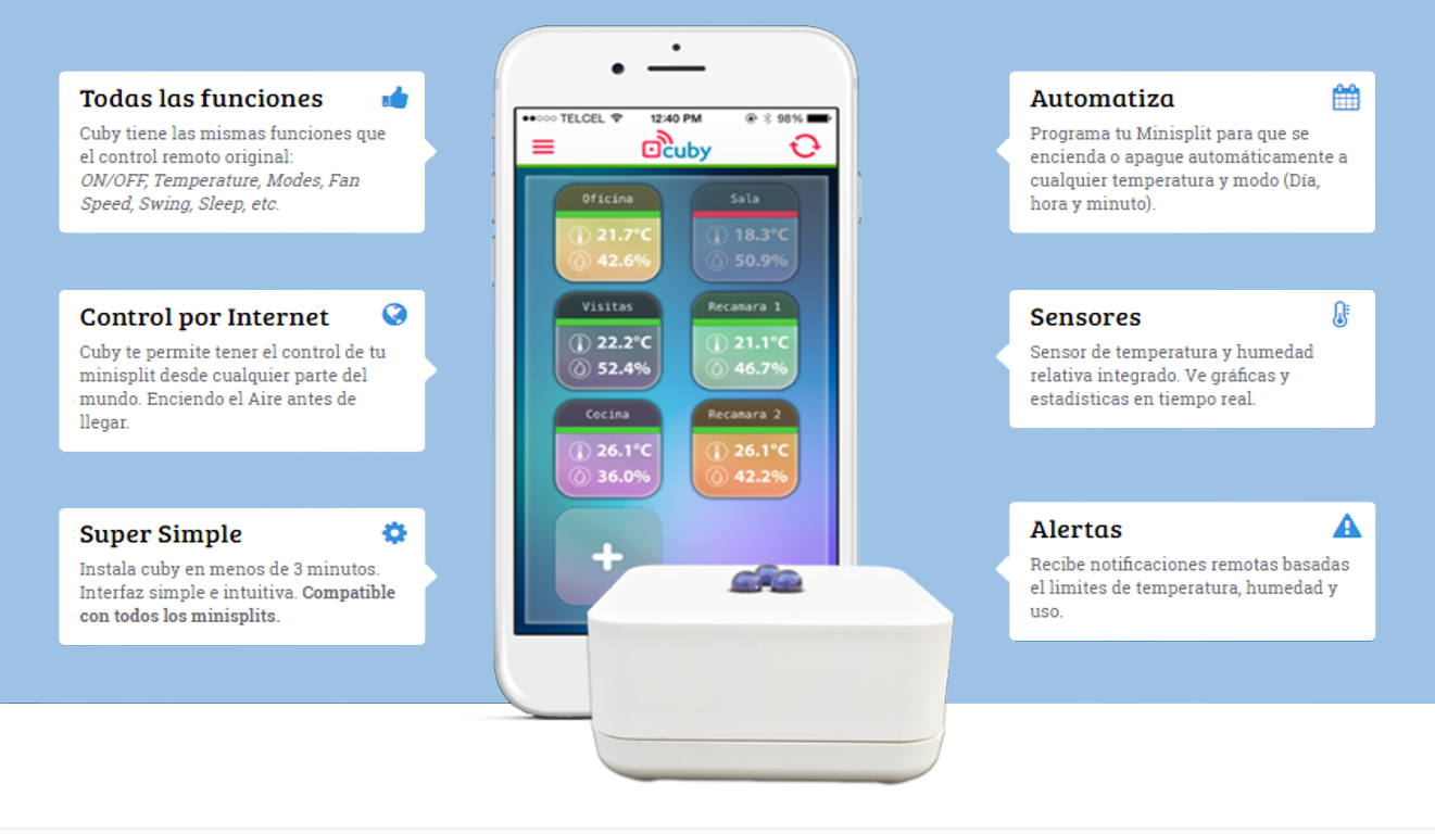 Cuby se conecta a Internet a través de tu red WiFi y controla tu minisplit enviando señales infrarrojas iguales a las del control remoto original. Saca a Cuby de la caja y en menos de 3 minutos estarás controlando tu equipo minisplit usando tu smartphone desde cualquier parte del mundo